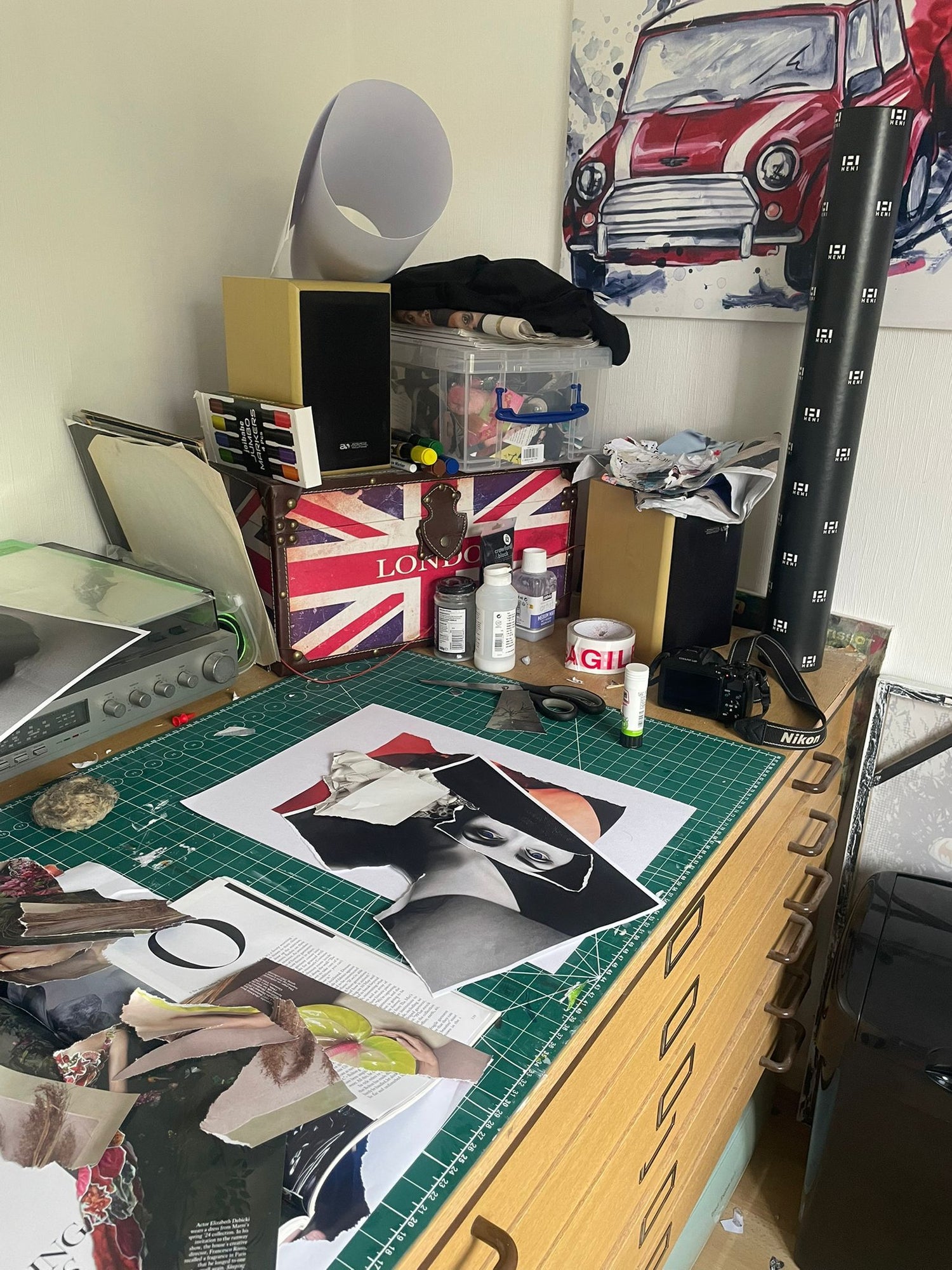 Most of what I use I find out in the world — mainly in Soho. I’ll tear down old posters, grab scraps from alley walls, anything that looks like it’s got a bit of history in it. Sometimes I’m running from places I probably shouldn’t have been. I like the roughness, the grit. I’ll layer those textures up with bold imagery, mix in old magazine fragments, then mess with the surface until it feels right. Half the time I don’t know what I’m chasing until it starts to show up in the work.