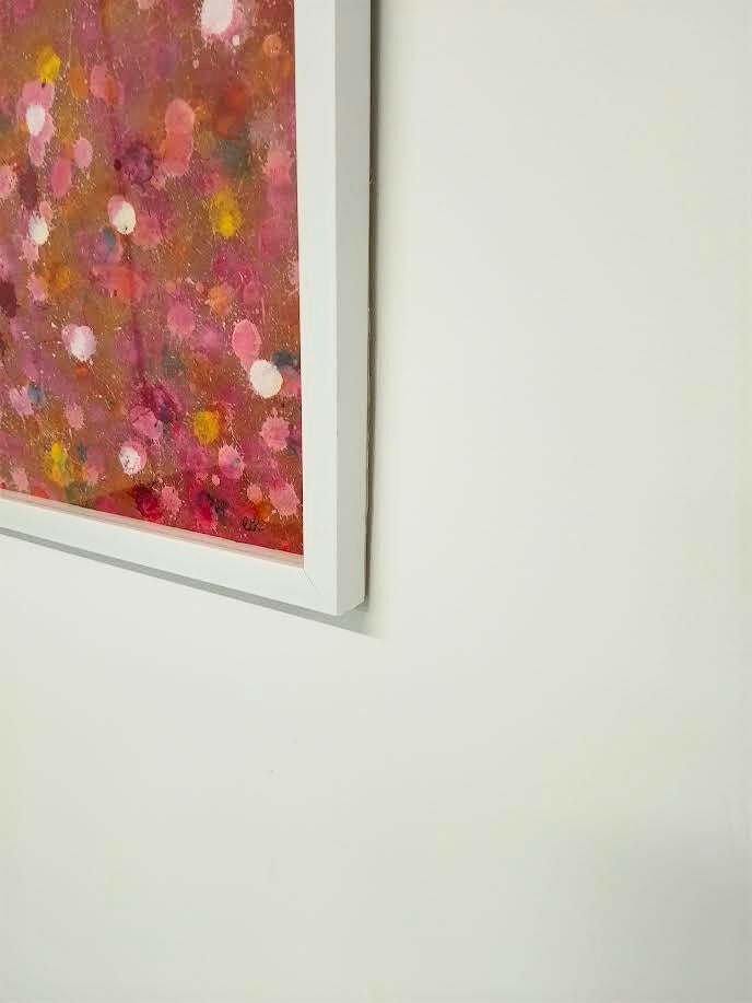 The work thrives on its density and vibrancy. Each dot, drip, and bloom feels spontaneous yet interdependent, building a visual symphony that mirrors community itself: layered, imperfect, but undeniably alive. It carries both intimacy and expansiveness — the sense of being one among many, held within something larger.