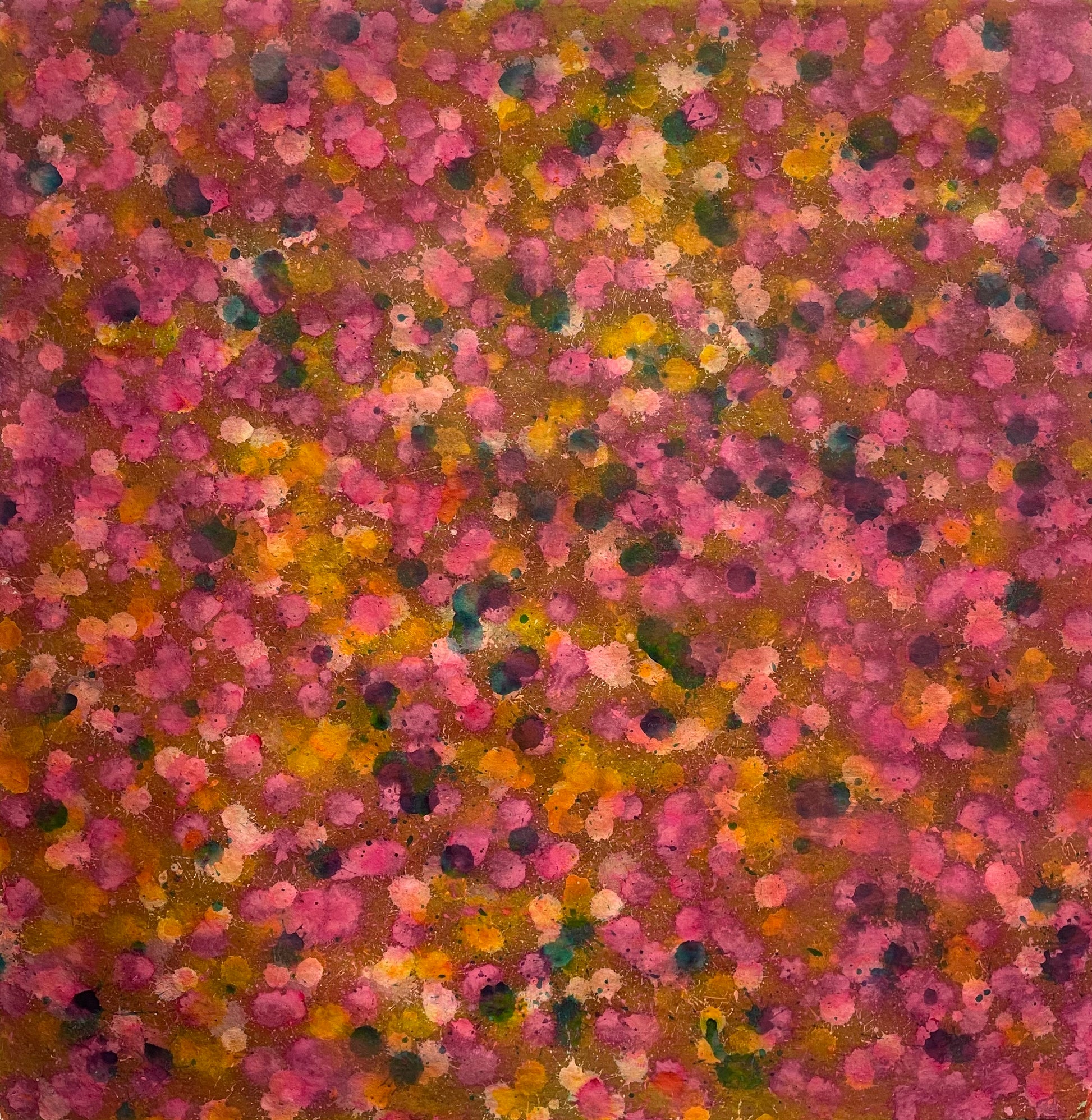 The piece feels alive—vibrating with movement, yet deeply grounding—capturing both individuality and unity within its vibrant field of dots and splashes. True to Kusitor’s practice, the work balances expressive spontaneity with emotional intention, inviting the viewer to sit and meditate.
