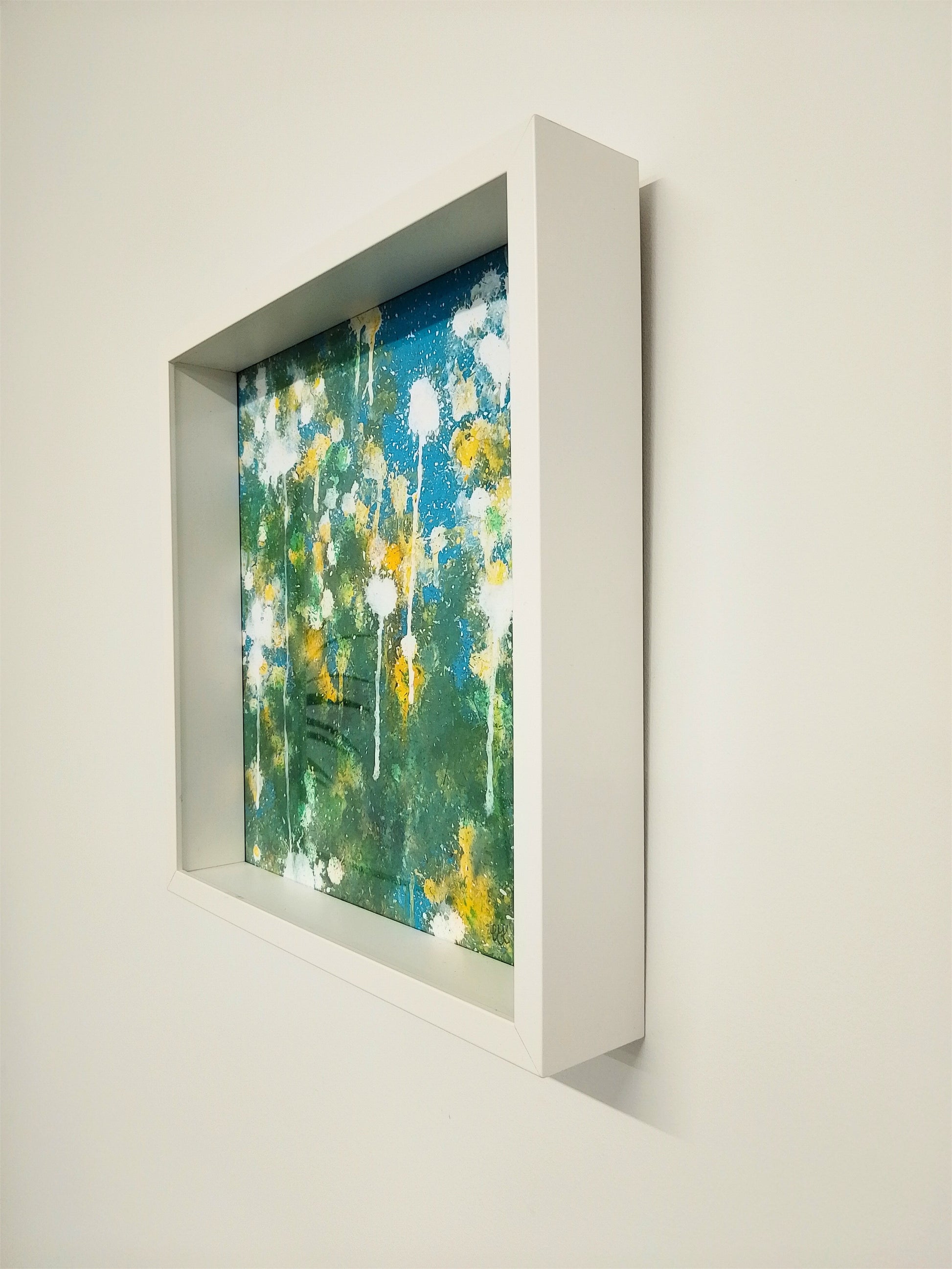 “A Sprinkle of Dew” radiates freshness and wonder, as if the world has just awakened. Luminous whites drip and scatter across a deep, atmospheric field of green and blue, recalling morning light caught on wild grasses or dew suspended on leaves. Gold accents shimmer beneath, like sunlight breaking through, giving the work a sense of vitality and quiet abundance.