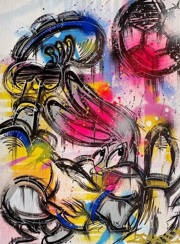 "Bicycle Bugs” explodes with kinetic energy — a mash-up of street art attitude and cartoon nostalgia. The figure of Bugs Bunny emerges in bold, black strokes, raw and unfiltered, his familiar charm reframed in a frenzy of motion. A soccer ball hovers above, while sprays of neon pink, yellow, and electric blue pulse across the canvas, giving the piece a graffiti-like immediacy.