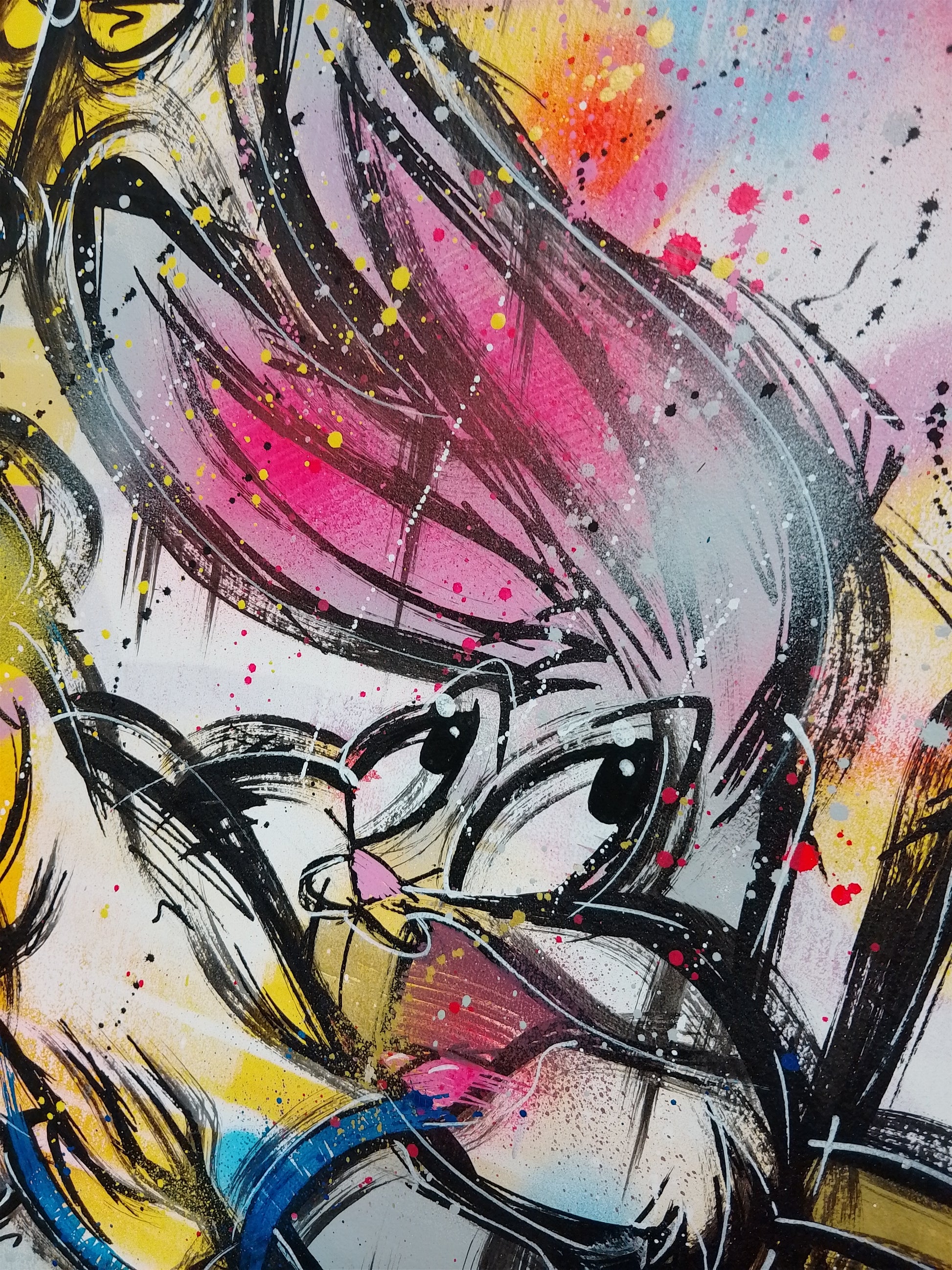 What makes this work magnetic is the collision of worlds: childhood innocence meets urban grit, animation collides with abstraction. The drips, splatters, and layered gestures resist polish, instead embracing spontaneity and edge. It feels alive, rebellious, and playful — a work that winks at pop culture while demanding to be taken seriously as art.