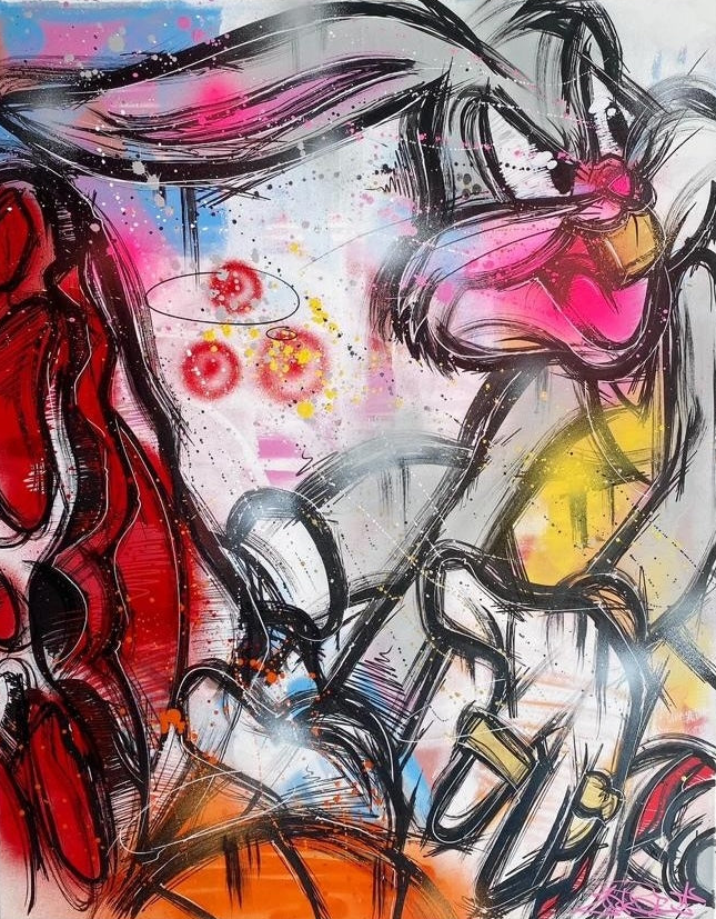 Bugs Ball unleashes Zokoe23’s signature graffiti style on a pop-culture legend. Bugs Bunny explodes across the canvas in a riot of neon colour, bold spray strokes and rapid-fire linework — part street art, part animation freeze-frame.