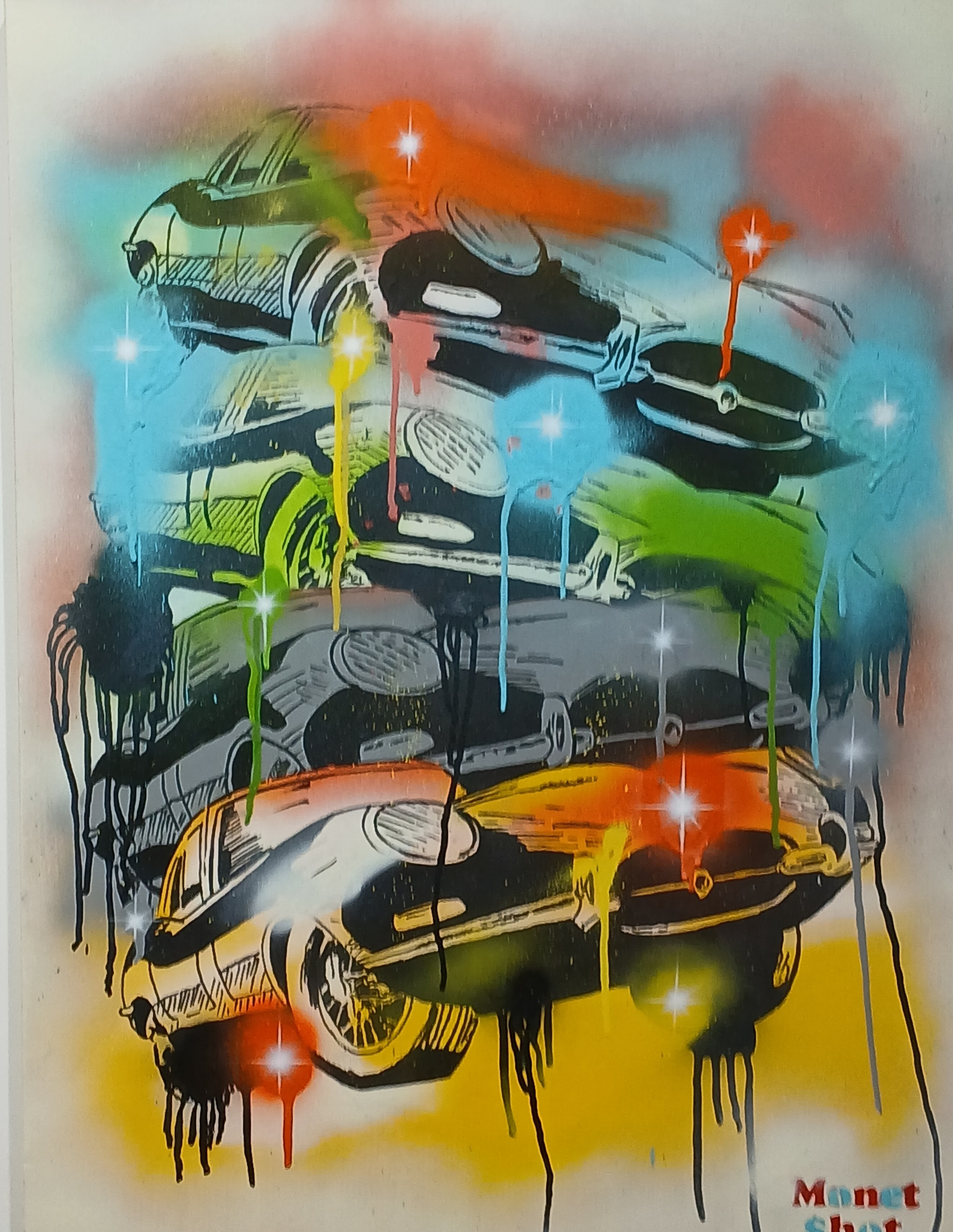 Working on a large scale, my paintings are constructed with traditional processes using oil and acrylic paint, but also incorporate stencils, screen-print and airbrush work to build up a ‘collage’ aesthetic in which multiple image sources cross-pollinate. Some of the images I use are personal, some universal, and though the final composition can be ambiguous there is a sense of an underlying narrative – often with a social commentary. Consumerism and the visual language of advertising – both current and historic – are prominent in my works, which therefore often have a playful, absurd quality on first viewing, but which subsequently reveal a more ambiguous and sometimes provocative perspective on the world around us. Within my latest work, the narratives I create operate by key images in a ‘resting place’ that is alien to them, confusing the source image. This approach is a generative act, rejecting old certainties and opening up new meanings and ways of understanding postmodern culture.