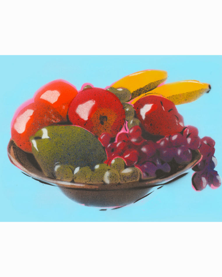 The fruit bowl explores a classical subject matter through contemporary stencil and spray methods. Using a limited palette, purple and yellow mix to make the warm and cool green tones, with an unregistered black sketch outline giving additional structure to the shapes.