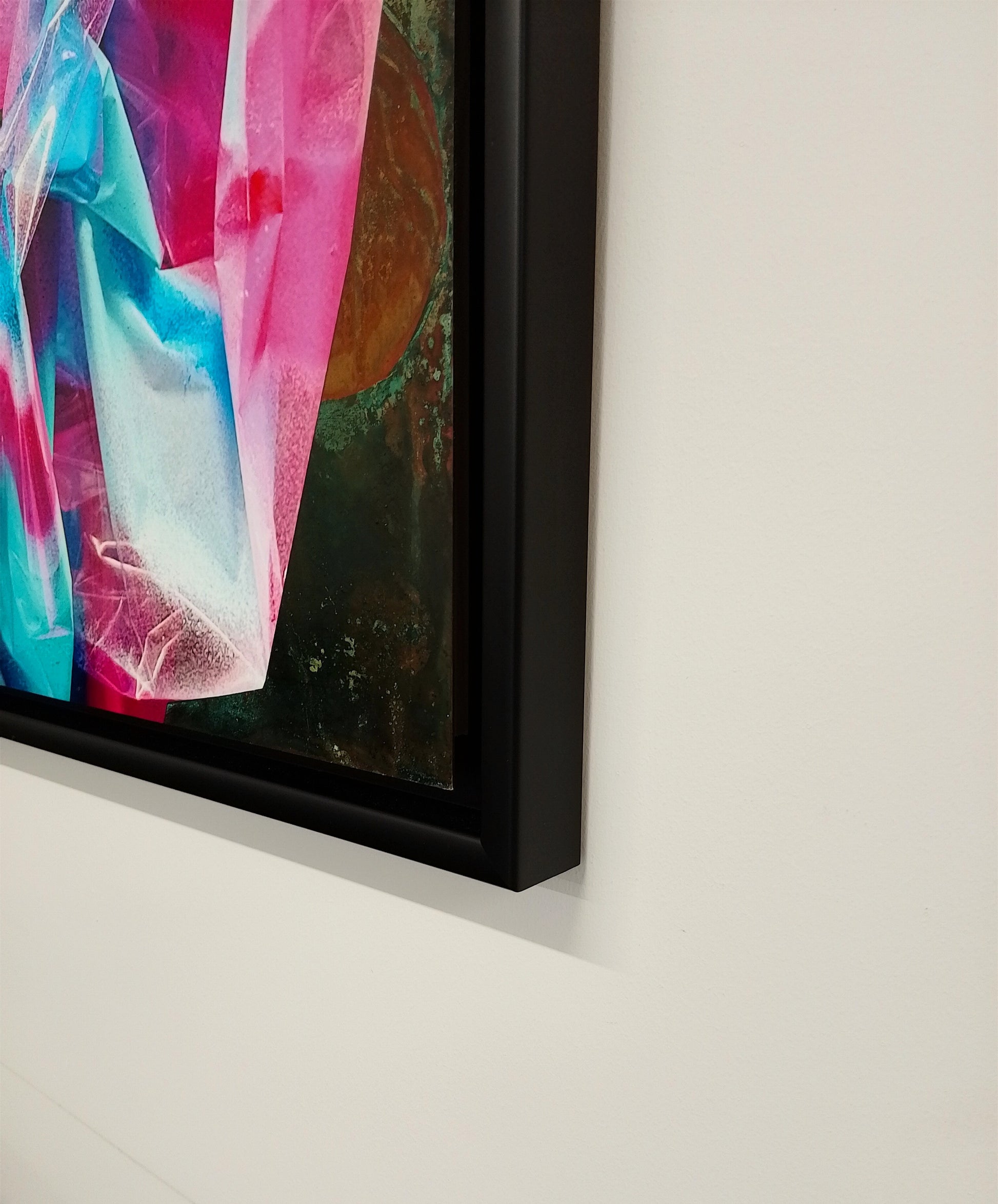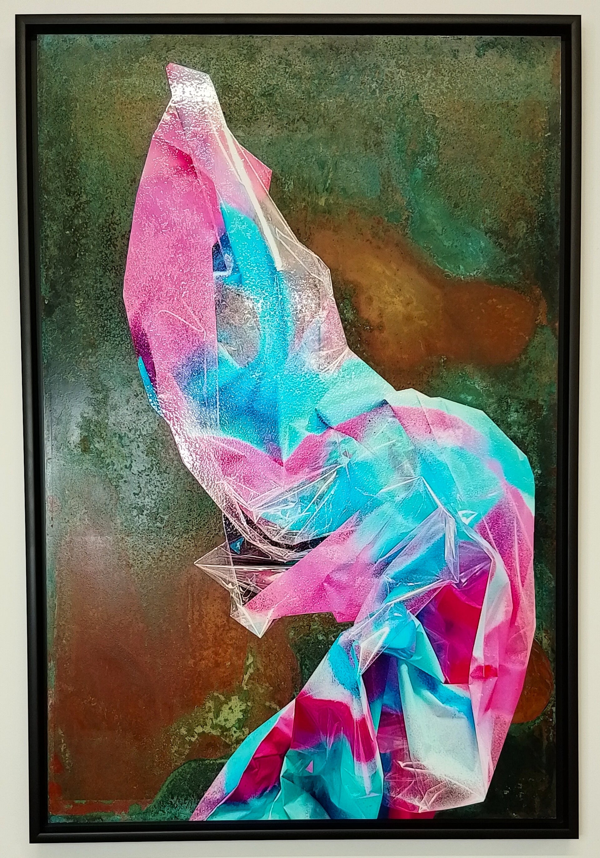HEXA4 by Oli Fowler unfurls like a luminous ribbon suspended over a richly weathered copper ground. Vivid pinks, electric blues, and soft turquoise tones drift through a sculptural, folded surface that feels both fluid and meticulously constructed.