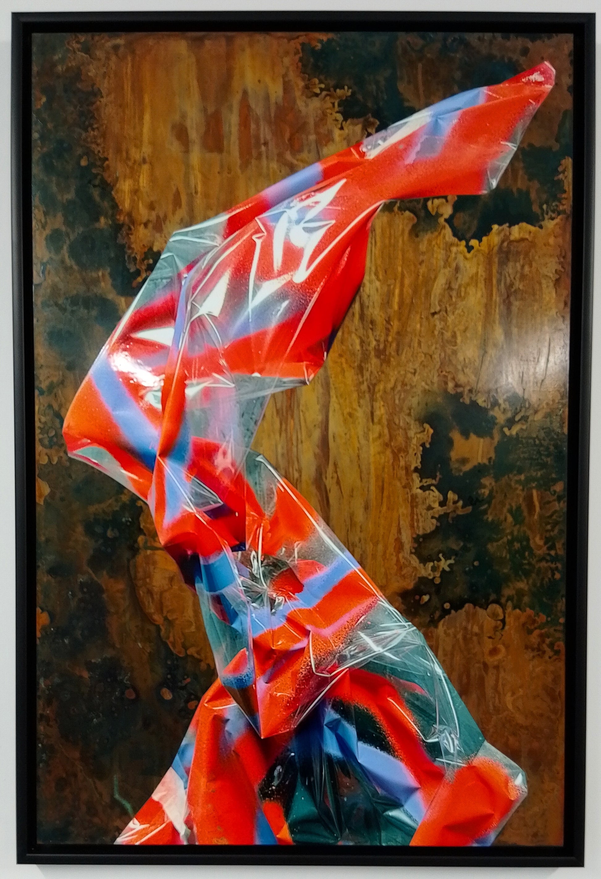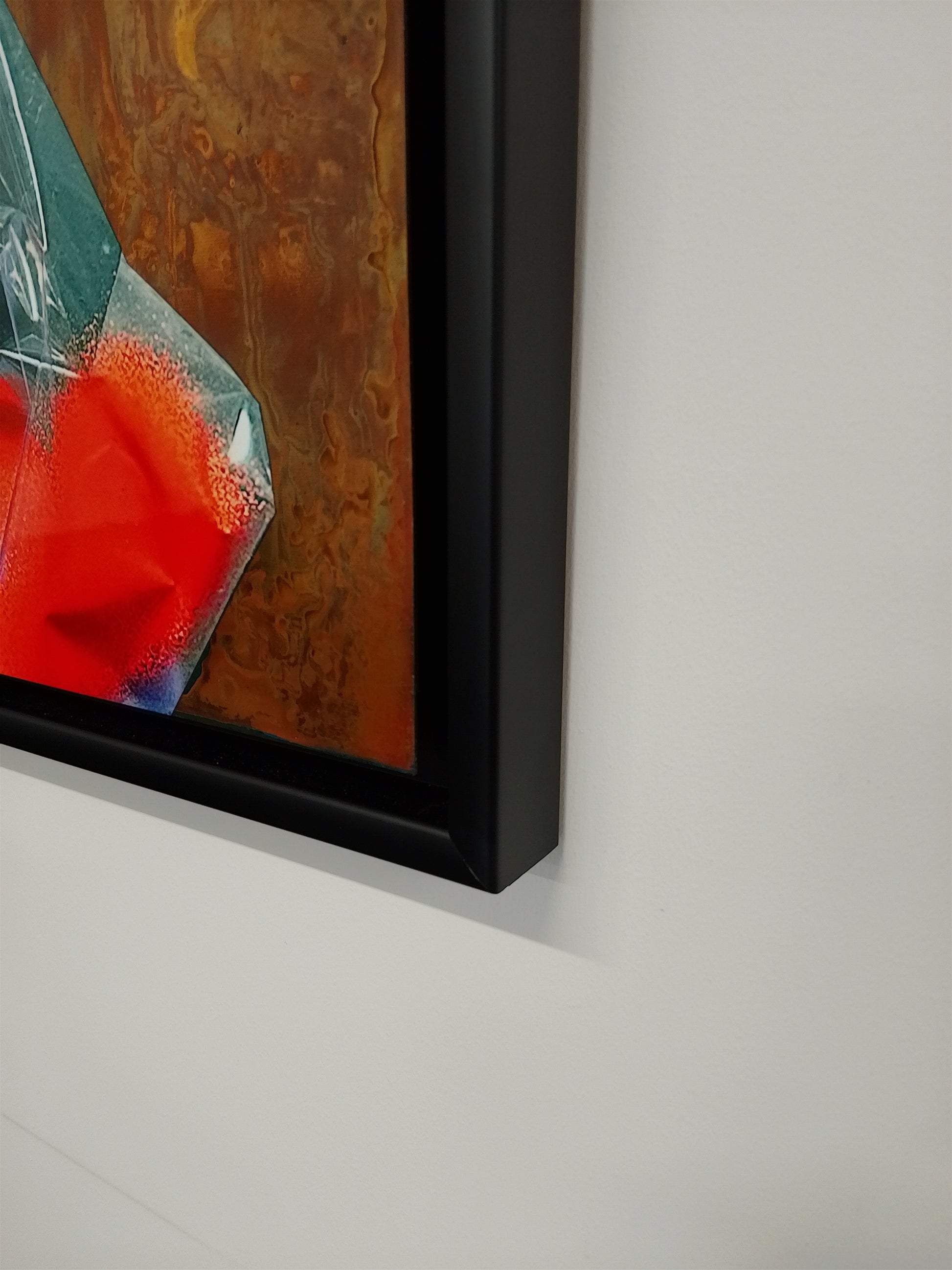 HEXA7 by Oli Fowler rises like a sculptural ribbon of energy, its sharp twists of red, violet, and electric blue cutting through the deep, weathered patina of oxidised copper. The form feels suspended in motion, capturing the interplay between chance and precision that runs throughout Fowler’s practice.