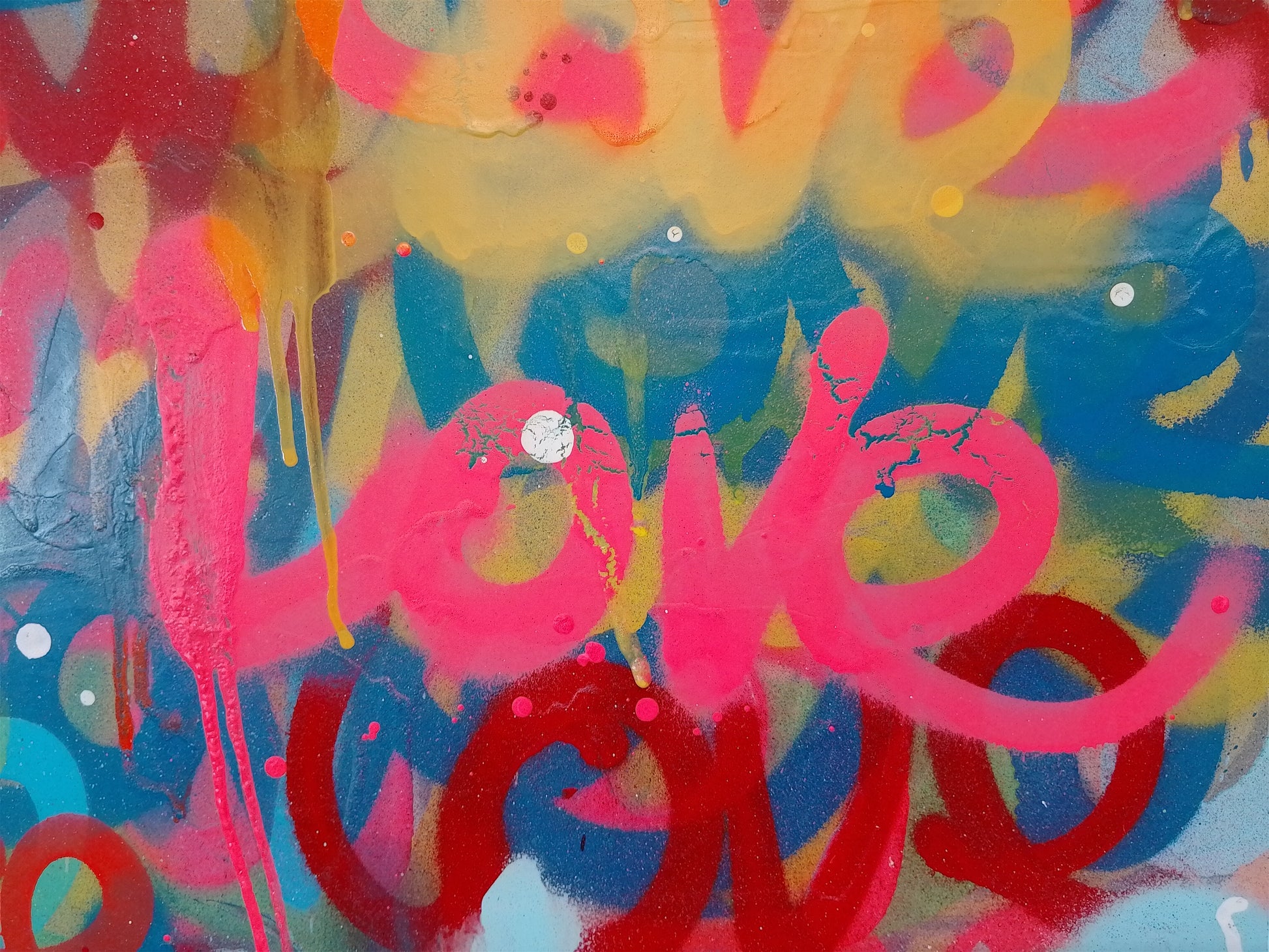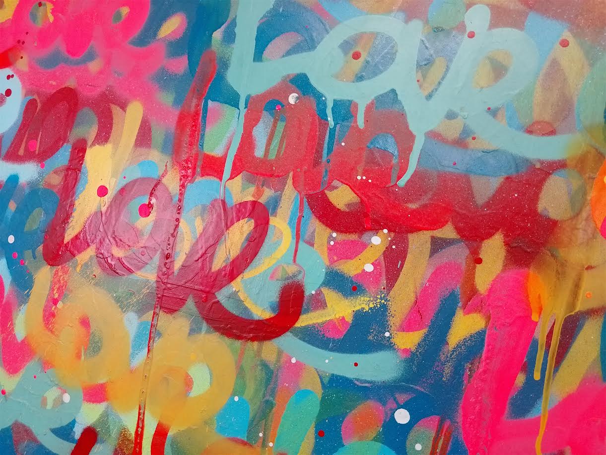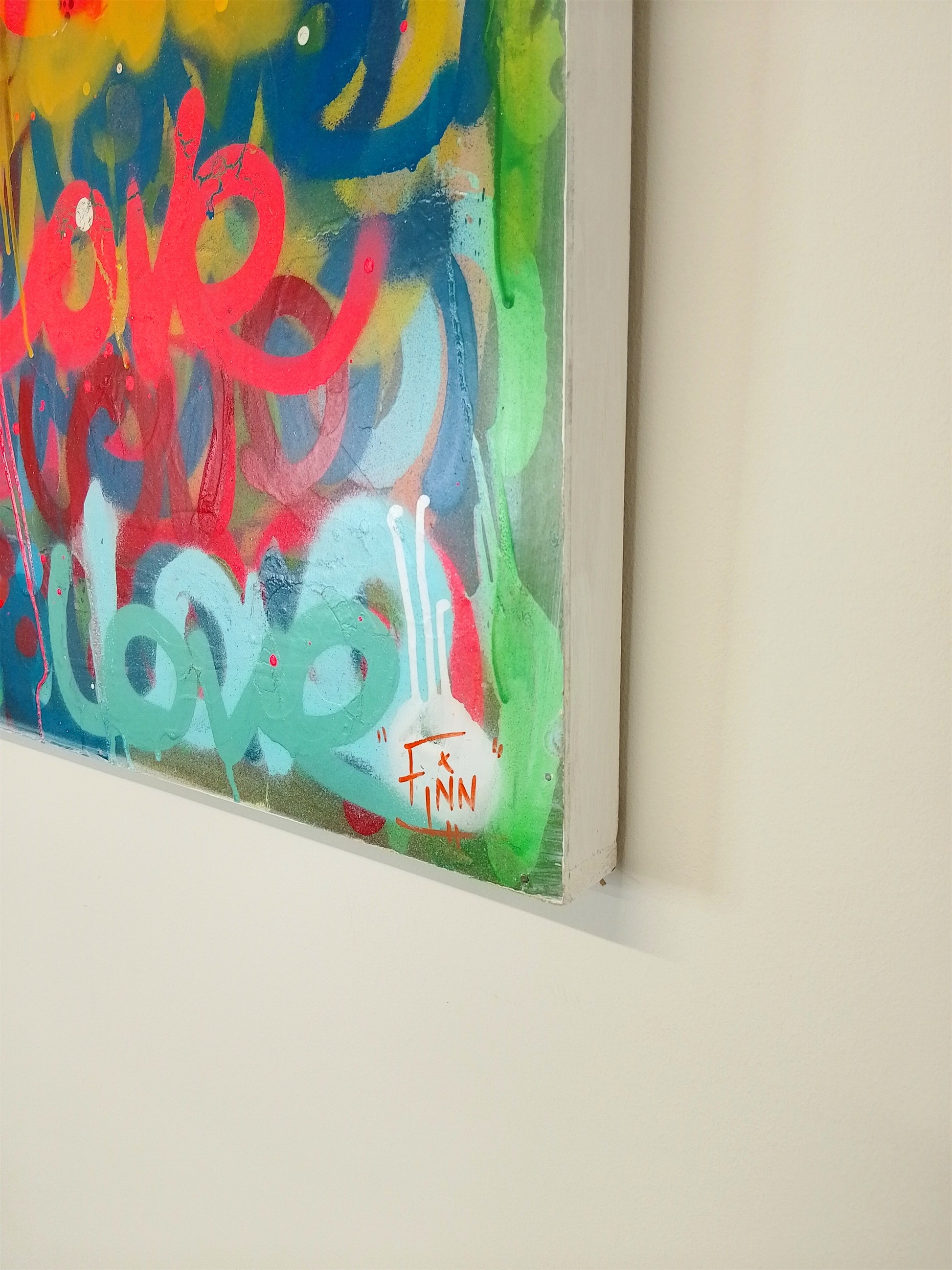 This striking original artwork bursts with colour, energy, and emotion, featuring the word LOVE layered in vibrant graffiti-style lettering. Created using spray paint and premium paint pens, the piece radiates positivity and urban expression.