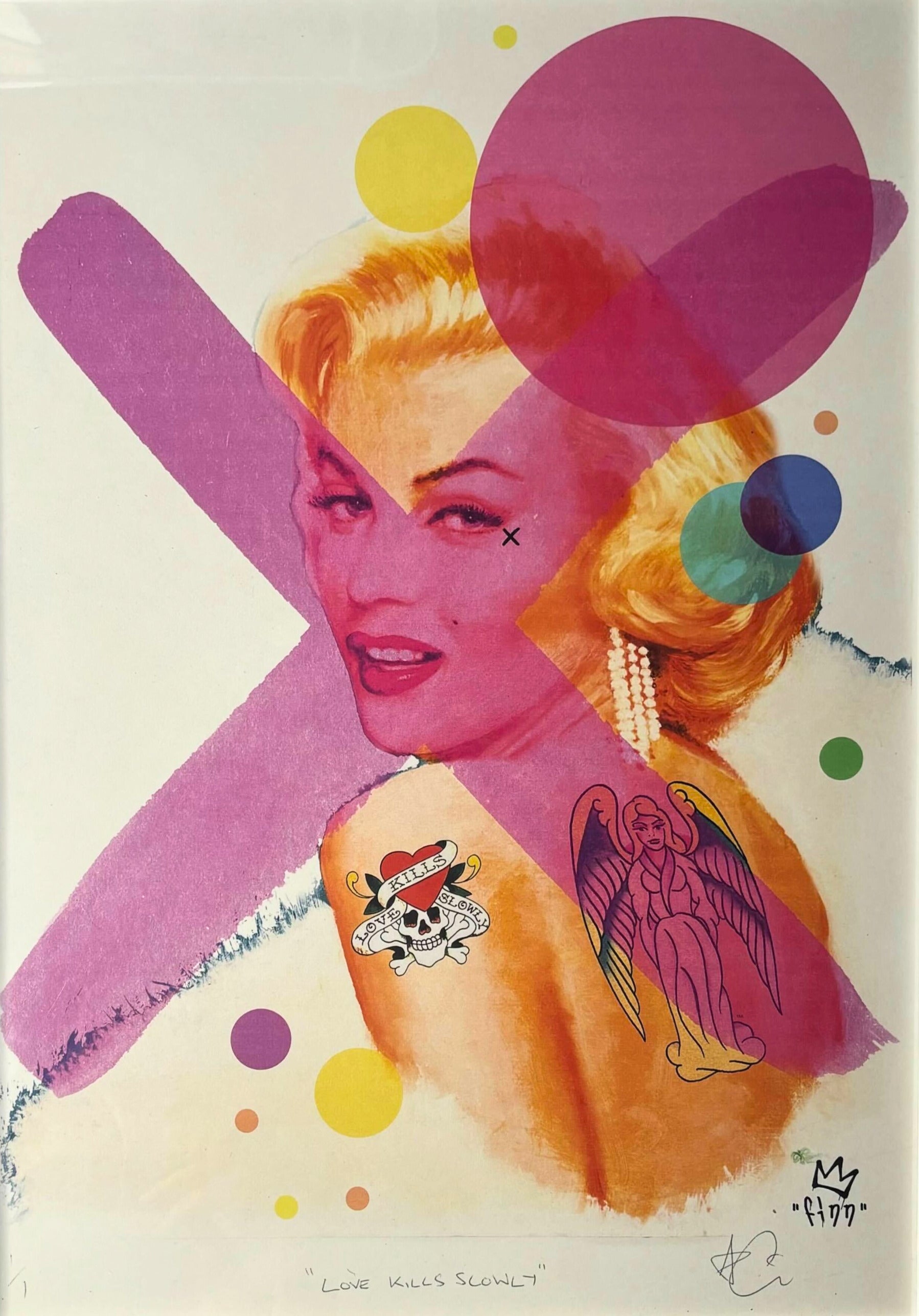 Love Kills Slowly is a rebellious twist on pop culture iconography—blending old Hollywood glam with tattoo art, bold color overlays, and street-style symbolism. A classic pin-up figure, reminiscent of Marilyn Monroe, is disrupted by a hot pink ‘X’, playful circles, and bold ink graphics including a skull-and-heart tattoo reading the piece’s title.