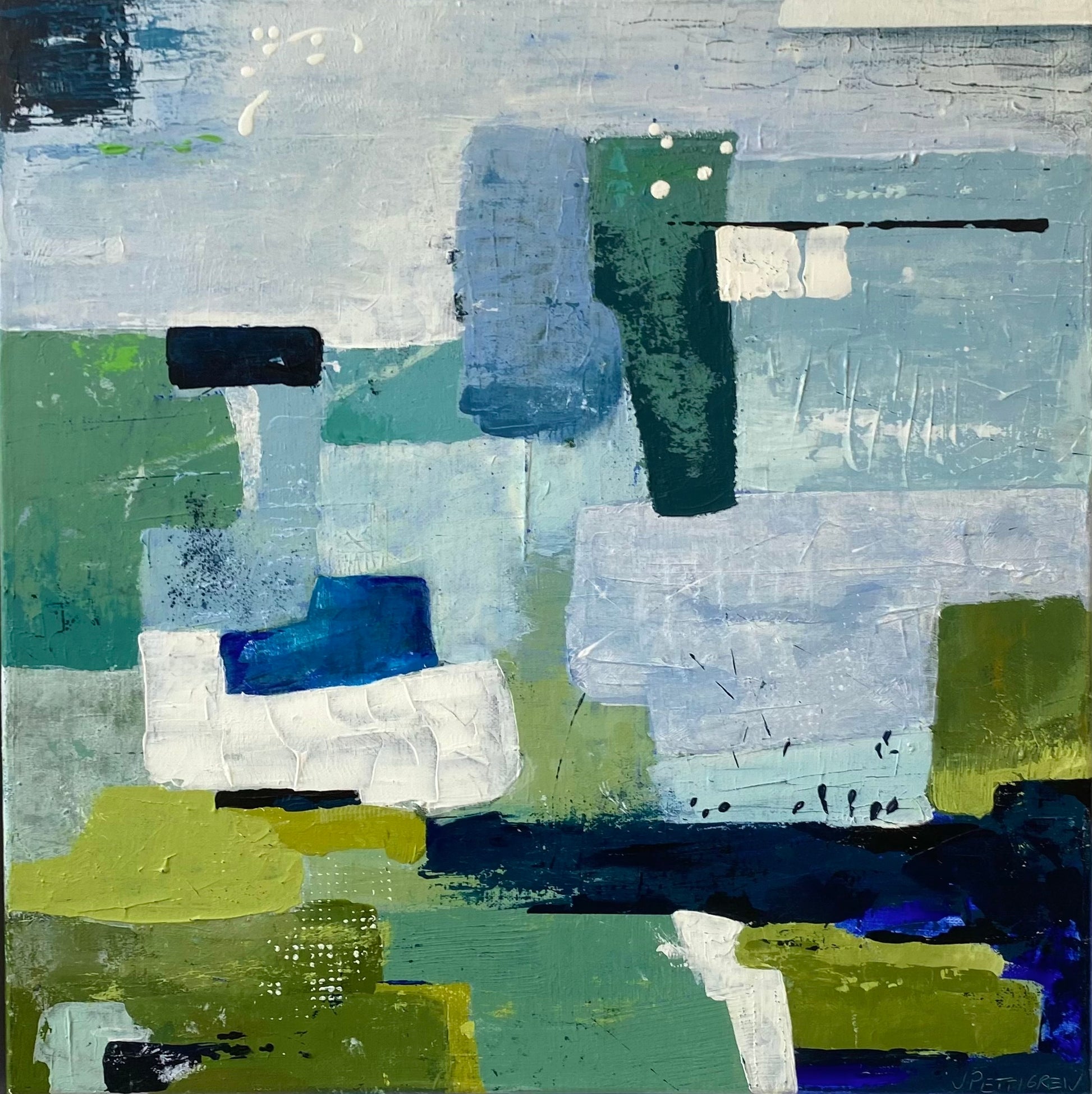 One Upon a Time unfolds with a sense of calm progression. Layered acrylic and pastel marks guide the eye upward through shifting tones of celadon, deep navy, moss green and soft white. Pettigrew’s buffed cold-wax finish gives the surface a beautifully tactile, stone-like texture.