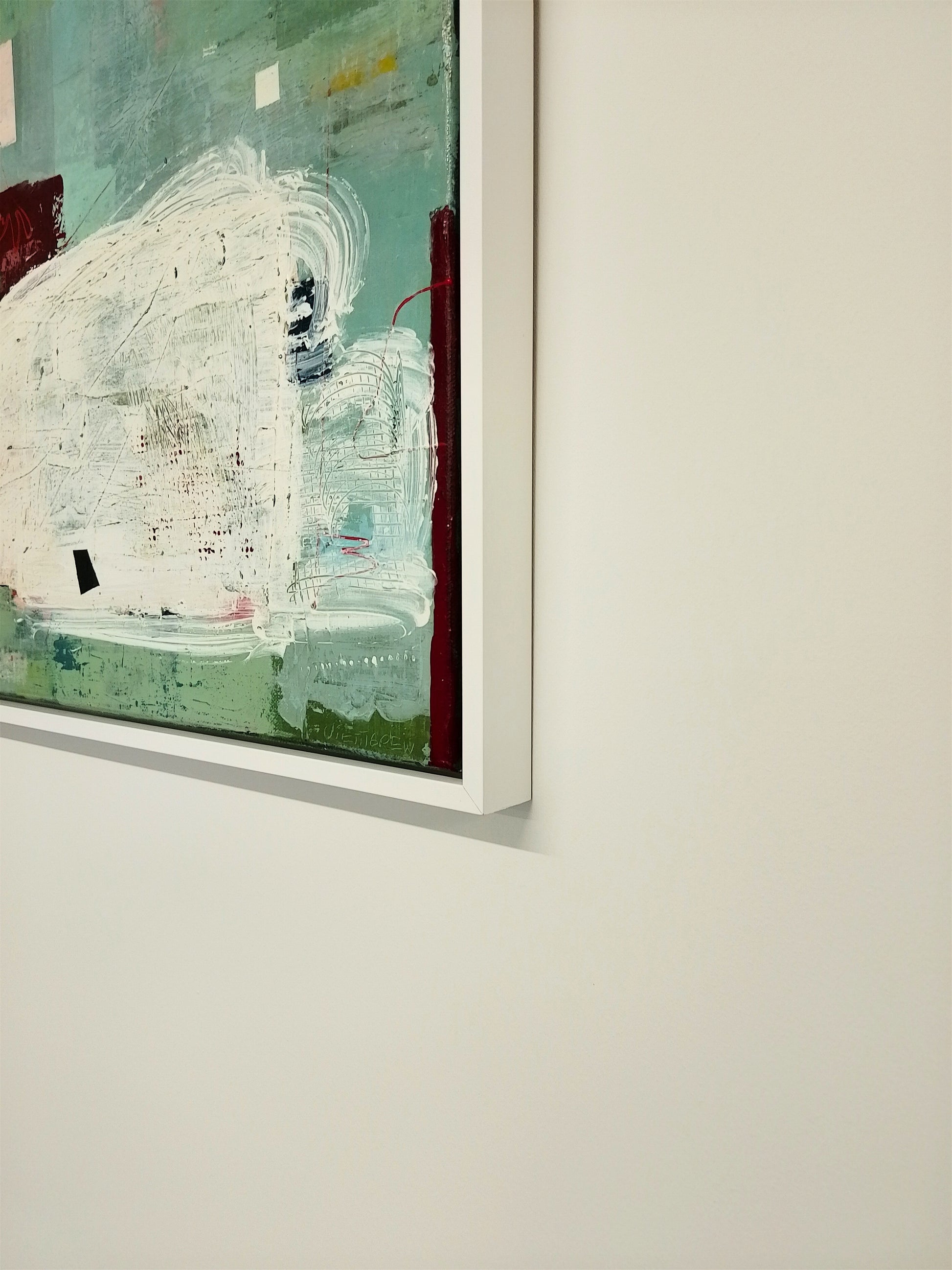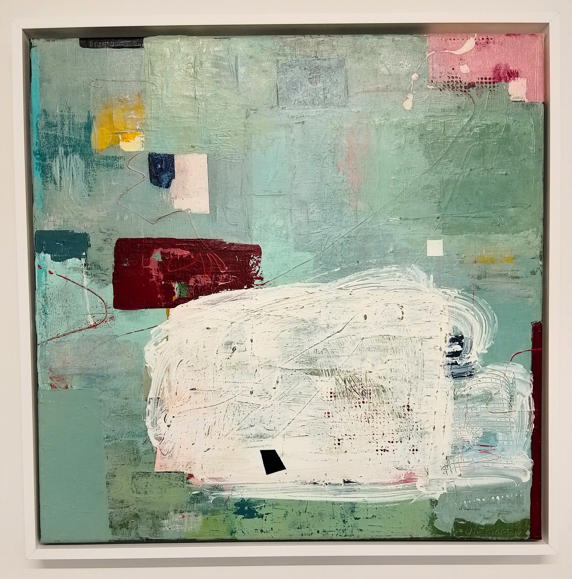 One Step At A Time presents a compelling study in intentional minimalism and abstraction. Pettigrew applies her technical discipline to this piece: acrylic paint and pastels layered over a buffed cold-wax finish, enclosed within a crisp white floater frame.