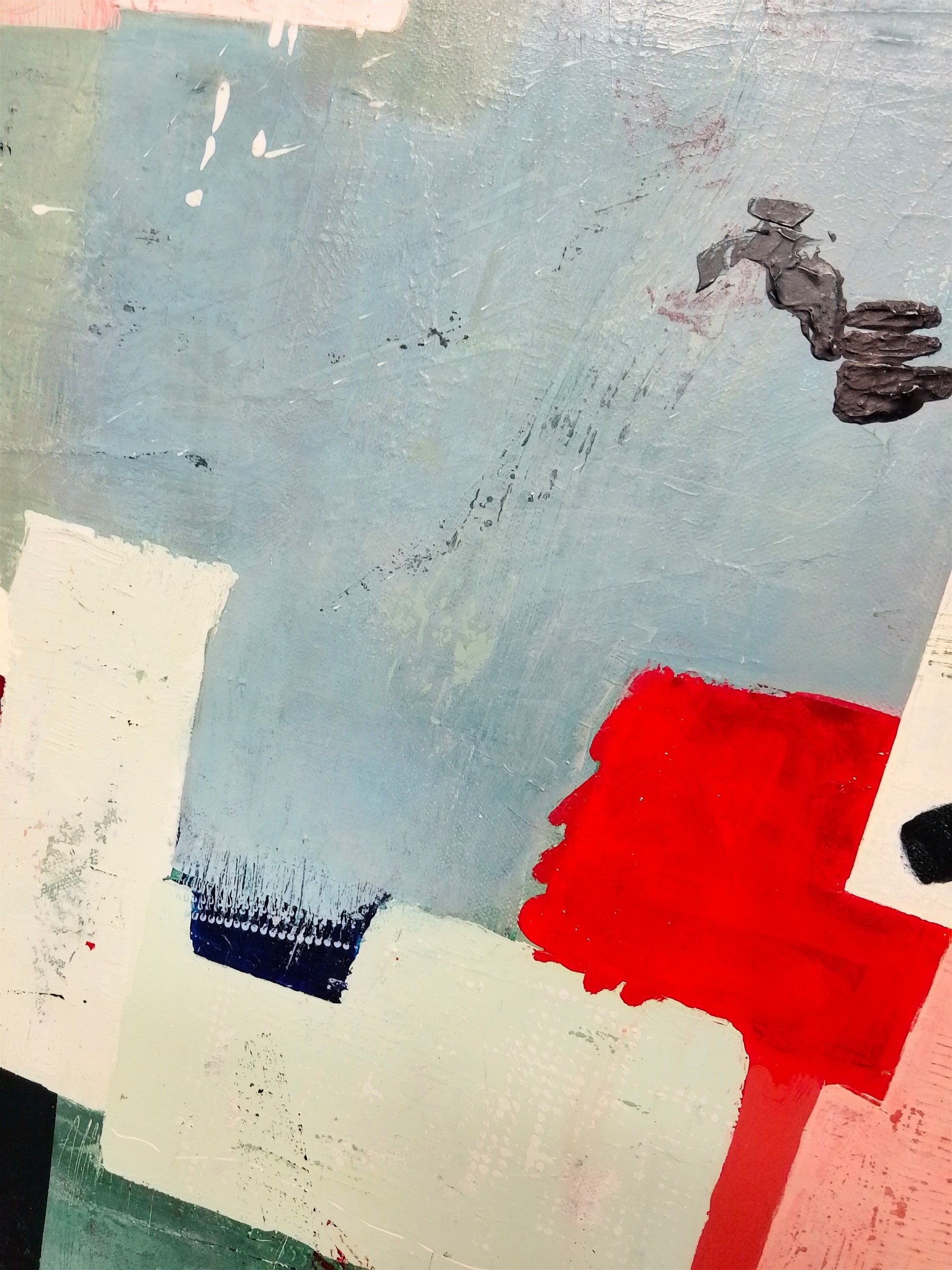 “Summer in the City” bursts with the rhythm and pulse of urban life translated into color and form. Planes of dusty rose, teal, indigo, and moss green press up against one another, intersecting like streets, buildings, and fleeting moments in motion. Pops of crimson and mustard act as sparks of energy — the unexpected encounters and vivid impressions that punctuate a day in the city heat.