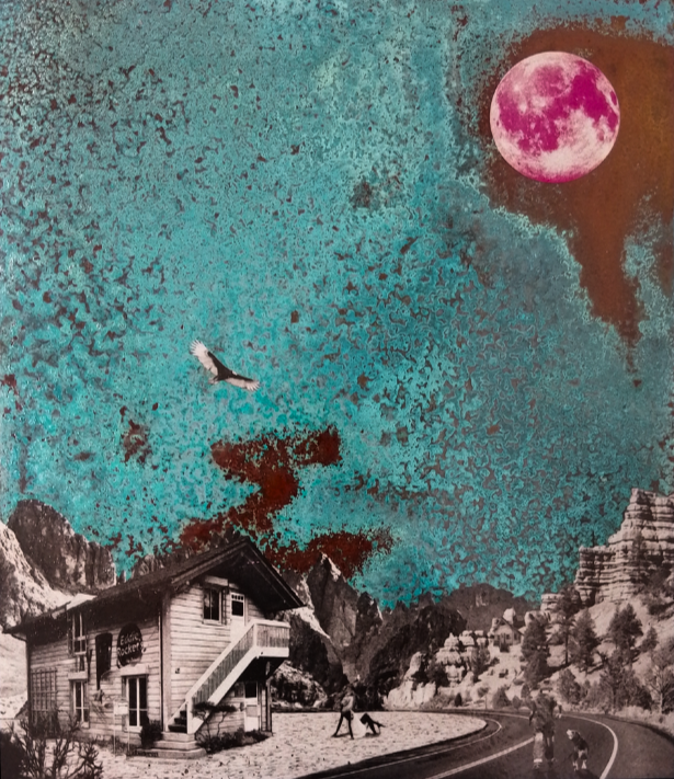 The Road by Oli Fowler unfolds as a quiet reflection on time, memory, and personal journey where a richly oxidised copper surface forms a weathered backdrop for a winding printed collage drawn from vintage magazines.