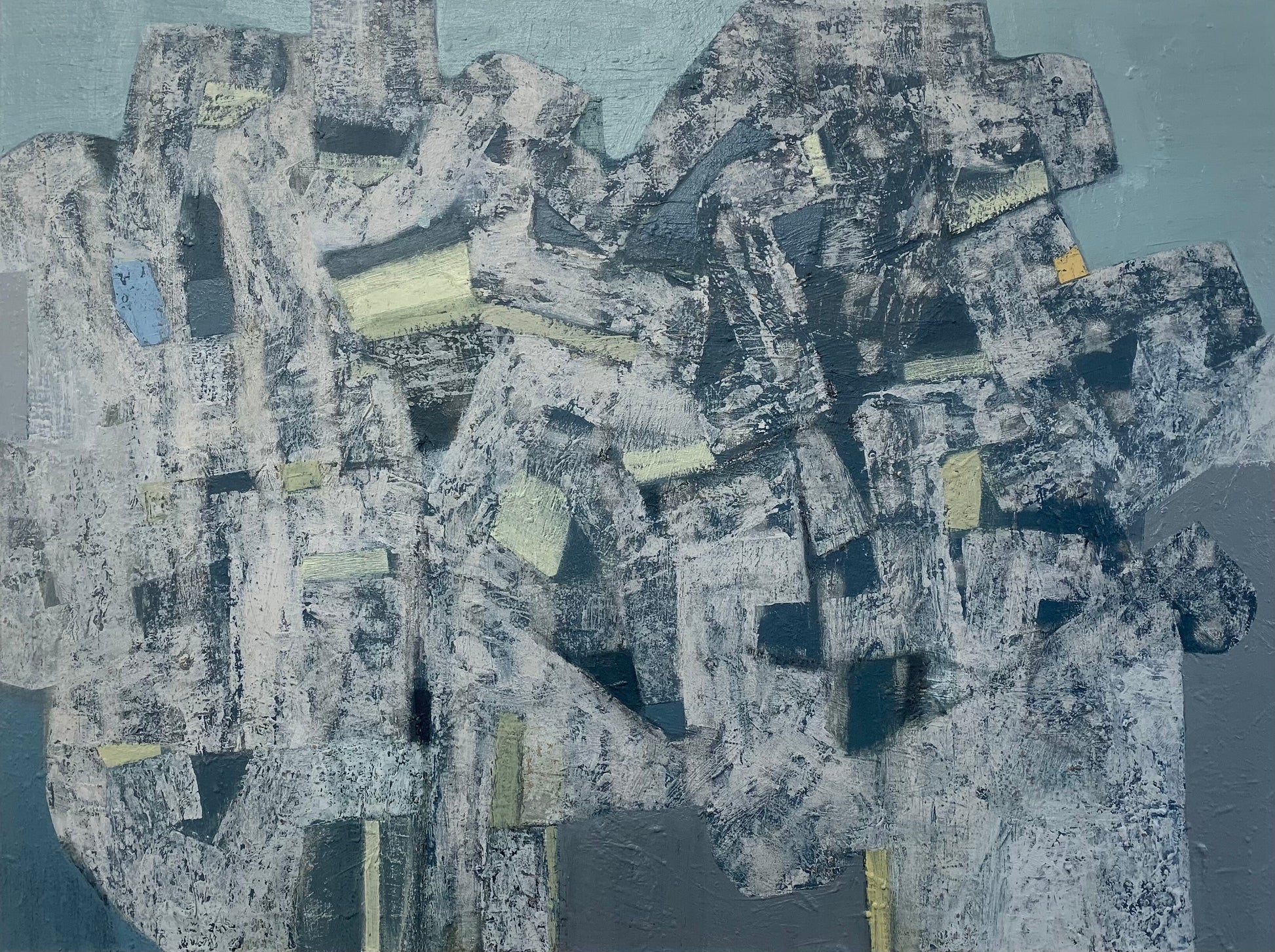 Trampled is a layered abstraction that captures the quiet turbulence of surfaces shaped by time, movement, and human presence. Bowder-Ridger works in oil with her signature sensitivity to texture, building a mosaic of greys, muted blues, and chalky whites that feel scraped, pressed, and weathered—like footprints, scaffolding marks, or worn architectural remnants.