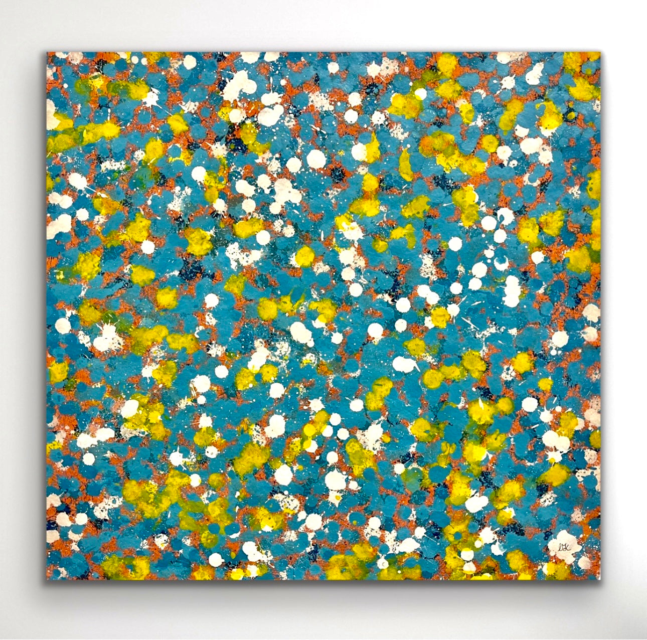 We Are All Children of the Universe is an expansive, joy-filled abstraction that radiates energy. Working with acrylic ink on handmade cotton, Kusitor creates a vibrant constellation of soft whites, luminous yellows, earthy copper tones and oceanic blues—each droplet and bloom of colour interacting like stars in the sky.