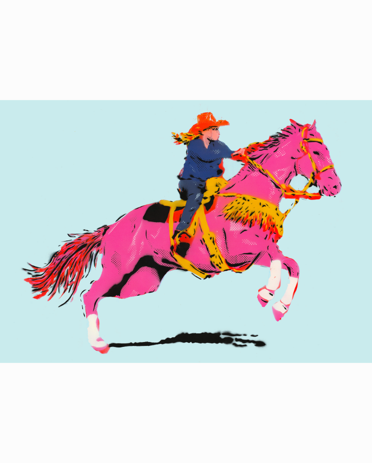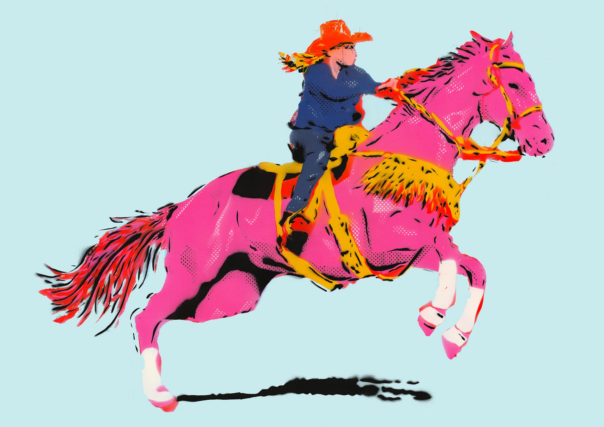 For centuries horses have been a symbol of war, prosperity & freedom. So far the year of the horse suggests only one of the three may be on the horizon yet this adorned horse leaps forward. Faux Ben-Day dots are employed in the shadows and highlights to add texture and reference the cowboy comic books from Max's childhood. Loose & unregistered stenciled outlines add movement and energy to the horse and rider.